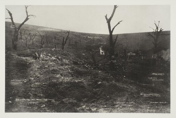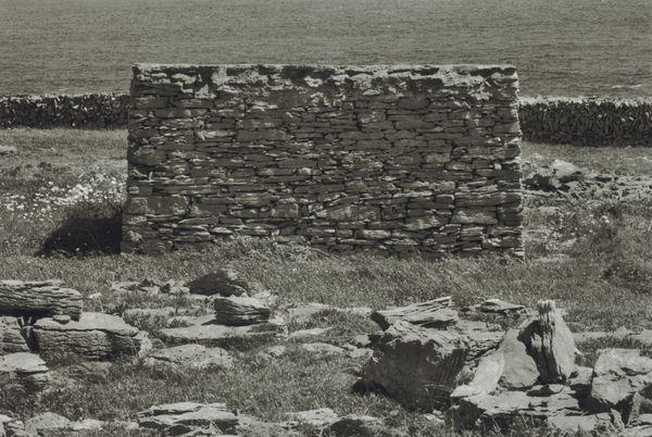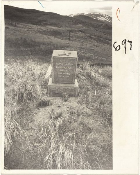 Editor: Here we have Robert Frank’s 1956 gelatin silver print, "Cemetery—Wyoming." It’s a stark image. I find it moody, very much of its time. A man seems to be tending a grave, another woman stands near some crosses and headstones on a weed-covered, windswept hill. It's hard to put my finger on what makes it so poignant. What do you see in this piece? Curator: Poignant is exactly the right word, isn't it? For me, Frank captured that specific brand of American loneliness that's as vast and empty as the landscape itself. You know, I can almost feel the wind blowing across that hill, hear the whisper of the prairie grass. It's a real gut punch, the kind that makes you question everything. He found beauty in the starkness of the ordinary, but there's a deep melancholia layered in, too. Makes you wonder what stories are buried beneath all those headstones, doesn't it? I think about the backdrops to family lore... do you get any of that? Editor: Yes! Absolutely. There's a timeless quality to that loneliness, something very human about our relationship to remembering. And now that you say it, the landscape itself does speak volumes, almost like another character in the photograph. The vastness makes them appear so fragile and isolated, as though swallowed up by the horizon. Curator: Right? I think it speaks to Frank’s genius in distilling grand themes, about life, death and memory, into singular moments. That ability, of capturing truth, or, really *a* truth that lingers and unsettles is really impactful. Editor: I can see why this photograph still resonates so powerfully. Thank you for sharing your perspective! Curator: My pleasure. I am off to ponder some Wyoming family histories!