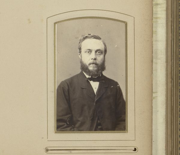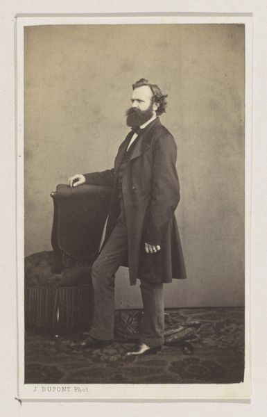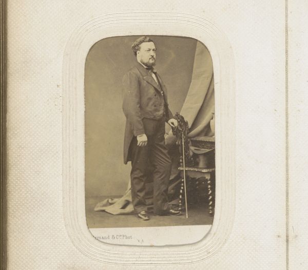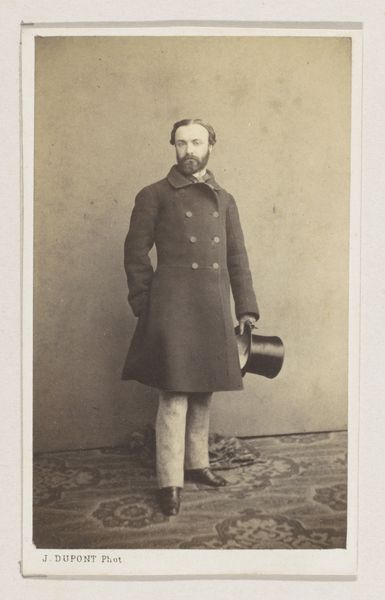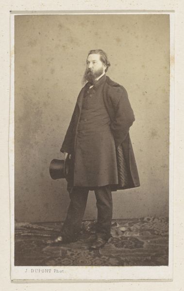 Curator: This striking photographic portrait, titled "Portret van een man met hoge hoed in de hand," was captured sometime between 1850 and 1900 by the artist J. Bohrlen. Editor: There’s an incredible stillness to this image; an almost somber quality. He seems caught between worlds, holding that hat almost as if it’s weighing him down. Curator: That hat—the high hat—carries so much symbolic weight of its own, doesn't it? In the 19th century, the high hat functioned as a clear signal of bourgeois identity. Class aspirations crystallized through clothing. His averted gaze tells another story, though. Editor: Exactly! His posture is rather stiff. He seems to represent how class and status often force one into molds—those hats become symbols of conformity, not necessarily success or freedom. Curator: Yes, his subtle tension between pose and expression embodies a broader theme. He's positioned against a faux backdrop, a staged landscape; it highlights how artifice attempts to overlay 'natural' hierarchies. Editor: A hierarchy where one can literally purchase the symbolism of freedom within constraints; it speaks volumes about what portraiture sought to capture. Curator: Considering the period—amidst various political revolutions and shifting social tides—one wonders what it truly cost him to maintain that symbol of success. Editor: It challenges us to consider the true cost of maintaining these types of structures, when certain sartorial choices might reinforce social barriers, despite personal anxieties about belonging within certain echelons of society. The image seems, poignantly, to want to reveal its subjects inner realities, more so than his material wealth. Curator: Well said, the contrast between societal projection and inner experience definitely gives one a pause. This image opens a portal into considering the lived realities of people in previous generations. Editor: This portrait's enduring message lies precisely in this capacity: that each generation deserves to excavate and reassess those historical complexities.