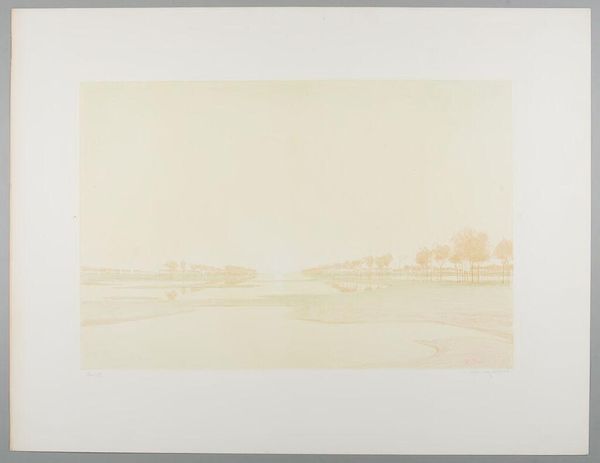 Curator: Larry Stark's "Early Morning Fog," housed here at the Harvard Art Museums, feels instantly…dreamy. Editor: It really does. There's a soft, almost pixelated quality to the print that makes the scene feel like it's dissolving before your eyes. Curator: Exactly! And the light! Look at how the pale pinks and blues bleed into each other, creating this hazy, ethereal atmosphere. I'm really moved by it. Editor: It's fascinating how the artist captures the fleeting nature of light and atmosphere, especially in a medium like printmaking, which is often associated with precision and control. The paper itself looks torn, which disrupts the supposed permanency of the piece. Curator: I'm getting a sense of stillness, like holding my breath so as not to disturb the scene. Editor: Right. And perhaps that feeling is a commentary on how landscapes were being framed in conservation debates at the time of the image's creation. Curator: I like that. It's as if Stark is not just showing us a landscape, but inviting us to participate in its delicate existence. Editor: Precisely. It’s a tender, visual poem.