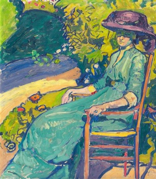 Editor: So, this is "Autumn Mood" by Victor Borisov-Musatov, painted in 1901. It's an oil painting. The overall tone feels very melancholy, almost dreamlike, with the muted colors and the woman's contemplative pose. How do you interpret this work? Curator: The beauty in "Autumn Mood" lies in its layered symbolism. The woman herself, posed with wilting roses, evokes a sense of fading beauty, perhaps a reflection on the transience of life and love. The Russian Silver Age was filled with these images of melancholy and reflection on time's passage, particularly among the aristocratic class depicted here. Editor: That makes sense. The setting contributes to that, doesn't it? The light filtering through the trees… Curator: Precisely. The indistinct background merges interior and exterior spaces. The boundary between them becomes blurred; the garden’s natural decline parallels an internal, emotional state. Flowers themselves are culturally loaded, yes? Here, the rose suggests romantic love or beauty, tinged with mortality and perhaps regret. Editor: The artist seems to be linking nature and emotion pretty closely. Curator: Consider too the woman's gaze averted, directed downwards, into herself. It mirrors the Symbolist era's emphasis on the inner life, inviting us to contemplate what unspoken emotions might be stirring beneath the surface. Borisov-Musatov creates a powerful connection through subtle cues. How do the muted colors inform your feelings towards the subject? Editor: I see your point! Now that you mention it, they do contribute to the sense of wistfulness… almost as if the colors themselves are fading just like the flowers and the season. Thank you; I see this work so differently now! Curator: Indeed. "Autumn Mood" captures a cultural memory, inviting us to reflect upon ephemeral beauty and emotional complexities inherent within ourselves. It is an elegant dance between outward representation and inward emotion.