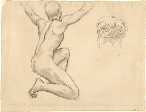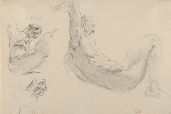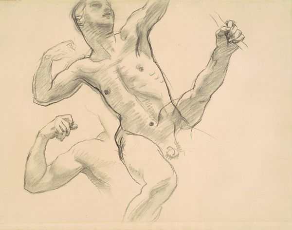 Curator: This intriguing drawing is titled "Studies of Notus for 'The Winds'," created by John Singer Sargent between 1922 and 1925. It’s rendered in pencil, showcasing Sargent's mastery even in a seemingly simple medium. Editor: Immediately, the figures strike me as intensely physical, almost theatrical. There's a definite sensuality, but also something caught, like the figures are captured mid-movement. Are we meant to be drawn to them? Curator: Contextually, these are preparatory studies for Sargent’s mural cycle decorating the Museum of Fine Arts in Boston. Understanding that they depict Notus, the Greek god of the south wind, offers us insight. This work operates within traditions of depicting male nudes and their role in defining "masculinity." It’s interesting to consider the male gaze that both shapes this work and, arguably, is catered to here. Editor: I see the classical roots you’re pointing to, yet there is an intentional raw quality to the sketches. The studies give the impression of spontaneous, fleeting images. Sargent captures musculature beautifully, highlighting the tension in the bodies holding what seem to be large, weighted spheres. Curator: Absolutely. Think of how classical sculpture used idealised forms to convey power, but Sargent seems less interested in an unattainable ideal. These feel very much like observational sketches – an artist working through ideas. I wonder, how did notions of masculinity and athleticism prevalent at the time affect Sargent's interpretation of this wind god? And did he intend to question these constructs? Editor: These drawings seem almost incomplete in that sense, or are offering a behind-the-scenes peek at his mural production processes. Considering they were intended as studies rather than finalized art pieces shifts their context, especially viewing them removed from the rest of the murals in their exhibition display. Curator: Precisely! Viewing them in isolation invites us to interpret them with different interpretive models, seeing them as records of the human form. In our contemporary context, and particularly since his works entered the museum spaces we now exhibit them in, we bring our awareness to the inherent politics of viewing and being viewed, influencing our reactions to this imagery. Editor: Thinking about how this work would originally contribute to a larger composition within an academic setting alters our perspective now; and what once might have evoked ideals of strength in men may carry diverse contemporary resonances, prompting new considerations around how bodies and the history of seeing bodies in Western art influence contemporary perceptions of identity.