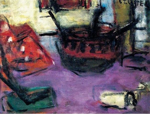 Curator: Before us, we have Eugene Leroy's "Snow," executed in 1953 using oil paint, adopting a "matter painting" technique. What are your initial thoughts? Editor: It's incredibly dense, almost tactile. The heavily layered paint creates this really powerful sense of compressed energy—a winter storm somehow captured. Curator: The layering, or impasto, is certainly key to the work’s overall structure. Notice how the compositional elements, while representational of a landscape, are subservient to the material quality of the paint itself. Consider, the structuralist idea here… the very notion of 'landscape' becomes deconstructed. Editor: And it is emotionally resonant. The limited palette evokes a specific feeling. All the blues and grays... what does winter signify in cultural memory? A time of introspection, of nature at rest, and of a stark encounter with mortality, surely. Curator: Quite. Leroy isn't necessarily painting 'snow', but he's certainly examining the semiotic potential embedded within the materiality, color and method. Editor: But aren’t symbols often buried in the abstract? Those few dashes of red...they’re small, but powerful in such a bleak vista. Are they hints of vitality? A latent spring waiting to burst forth? The promise of renewal against this somber setting, perhaps suggesting resilience in the face of the stark landscape? Curator: I concede, though I would lean towards exploring the red as purely an intervention into the canvas, challenging how we visually perceive foreground and background in relation to pure expressionistic force. It could indeed be read iconographically though. Editor: Regardless, Leroy asks us to see beyond surface depictions to delve into a landscape of the soul. It’s almost archetypal. Curator: Precisely, its power emanates from this dynamic and forceful structural balance – not necessarily a 'snowscape', but a presentation and powerful engagement of form. Editor: I appreciate your breakdown of the compositional elements, especially relating to color and scale and structure! Curator: Likewise, understanding how iconography allows cultural interpretation gives us an invaluable tool.