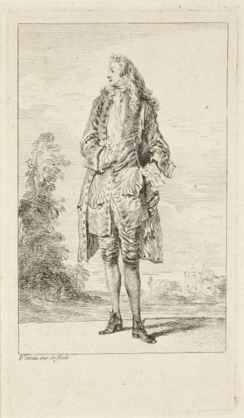 Curator: Looking at this print, one feels transported to a different era, wouldn't you say? It's an engraving, dating back to possibly 1781, titled "Portret van Willem II, prins van Oranje" created by Louis Sailliar. Editor: There’s a certain formality about it. The composition evokes a coming-of-age drama, but the subdued tones imbue it with melancholy. Curator: Absolutely. Sailliar captures Prince Willem II, a historical figure, against a backdrop suggesting power and lineage, with a regiment standing guard in the landscape. However, this Baroque visual rhetoric presents us with an intersection of gender and power dynamics worth exploring further: is this an effort to assert legitimacy? Editor: Yes, the symbolic weight is palpable. The figure’s youthful bearing juxtaposed with the trappings of leadership is central. Notice how the feathered hat, the decorative lace collar, the staff… These objects speak volumes about rank and tradition, almost a heraldic tableau brought to life. Even the trees surrounding him contribute to the idea of a continuous powerful lineage that permeates history. Curator: The visual language points to complex relationships. Given that Willem II’s reign was short and fraught with political tensions, to what extent is the artist idealizing the Prince for symbolic representation? How does it interact with, and reflect, the societal expectations of his role? Editor: Perhaps this image, with its precise linework, intends to create a lasting, unwavering image of the young leader. It speaks of power, duty, but also fragility—qualities we project onto figures destined for high positions. The surrounding military lends an aura of responsibility, as he seems poised to enter into their space. It hints at vulnerability, while being in charge. Curator: It gives one pause when considering what we visually communicate and how it affects our reading of not only art but also the politics and power surrounding the work. Editor: I agree, it's the enduring power of visual symbols – how they connect to collective memory and individual interpretation. It creates a powerful imprint, doesn't it?