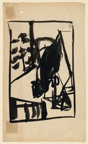Editor: This is Franz Kline’s "Woman Seated at a Table and Cat," from around 1940. It's an ink drawing, all stark black lines on a white background. It feels almost claustrophobic, the figure hunched over. What stands out to you? Curator: The confinement you perceive is fascinating. Considering Kline's later turn to large-scale abstract expressionism, this earlier piece gives us a glimpse into the cultural context of artists grappling with societal and personal limitations. It brings to mind the pervasive anxiety of the pre-war period, especially considering Kline was working during the rise of fascism in Europe. Is the figure burdened by the present, or is the setting weighing down the scene? Editor: Hmm, interesting thought. Perhaps it's both. The bold lines of the ‘room’ boxing her in definitely add to that feeling. I can almost feel the heaviness just from the thick black ink! But there’s also this… domestic scene. It makes me think of ordinary people living through extraordinary times, their quiet moments overshadowed by looming global events. Does that resonate? Curator: Absolutely. It makes you wonder about the artist's intent, doesn't it? Was he deliberately drawing attention to the socio-political climate, or was he simply capturing an intimate moment that, nonetheless, was unconsciously influenced by that climate? Also, how much agency does the “cat” have in its place, as observer of events, or the embodiment of a domestic dream now out of reach? Editor: I hadn’t considered the cat’s role like that. Curator: It’s vital to question how art depicts power structures and reflects societal anxieties. Museums need to embrace and be responsible for those questions. I feel like I am seeing something new thanks to you and our fresh look at Kline. Editor: And I better understand Kline’s historical setting now! It really adds another layer to the drawing.