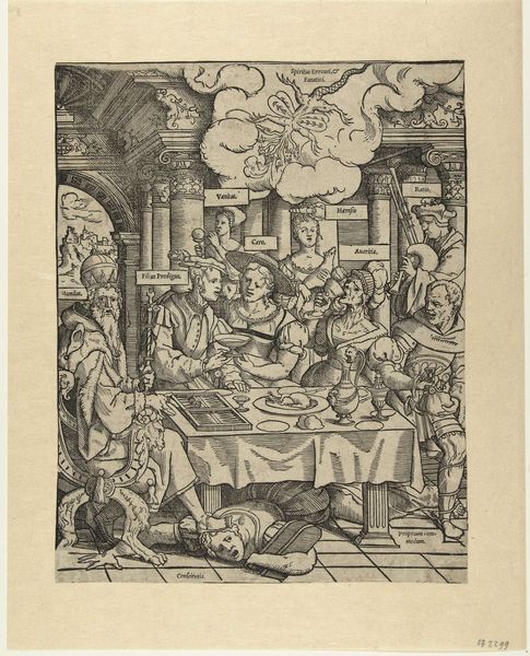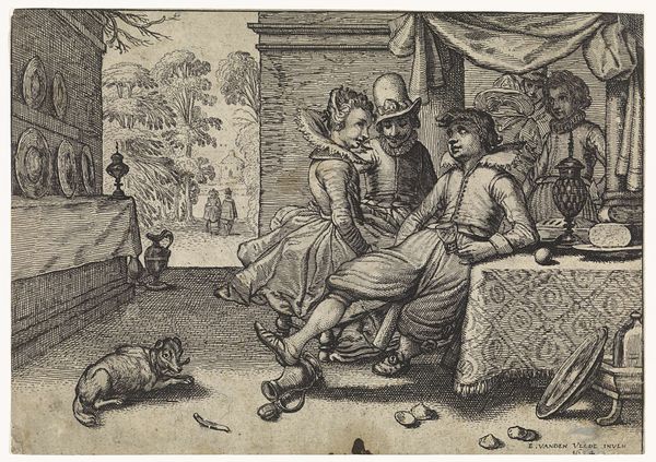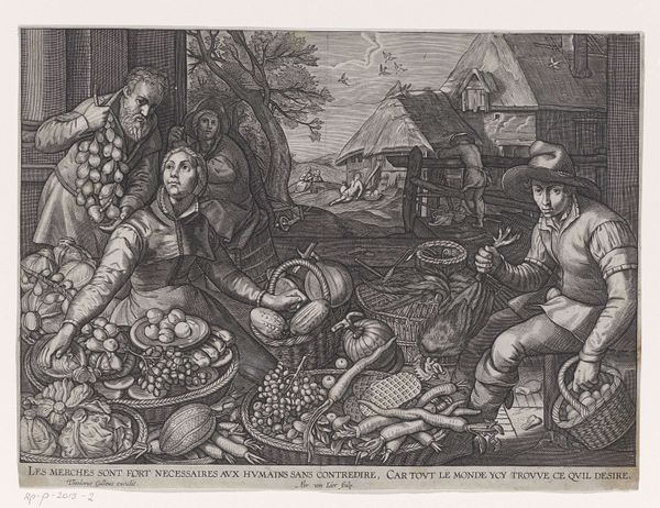 Editor: This is "Market Scene, the Rest on the Flight into Egypt in the Background" a 1603 etching by Jacob Matham, currently residing at The Met. What immediately grabs me is the density – all these intricately rendered details crammed into a single print! What do you make of such compositional choices? Curator: Note how Matham meticulously organizes the chaos. See the division between the foreground's still life, the middle ground’s bustle and the background, a narrative scene almost dreamlike. The figures are almost overshadowed by the textures and forms, creating a multi-layered spatial experience. This engraving focuses on visual complexities. Editor: That's fascinating, and I also notice that even though it’s black and white, the artist seems to use cross-hatching and line weight to create such varied surface textures. Why focus so heavily on what, I guess, seems like visual realism? Curator: Realism? Or visual information overload? This densely worked surface is a study in contrasting light and shadow, but consider how such treatment invites a specific gaze, a focus not on moral lessons as you would see in paintings, but rather on artistic virtuosity. Matham elevates mere produce into a complex exercise in technique, no? Editor: Yes, absolutely! I hadn’t thought about it that way. It's not just what's depicted, but *how* it's depicted. Curator: Precisely! The "what" is almost secondary to the "how," no? And that interplay, for me, is the source of this print's appeal. Editor: I now understand why some may call his focus as one based on technique. All that cross-hatching has completely redefined my impression of the work.