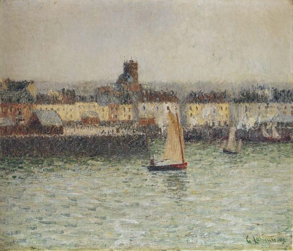 Editor: Here we have Gustave Loiseau’s oil painting "Port of Dieppe." The water, the buildings…they seem to dissolve into one another, a wash of muted color. It's really the brushwork that strikes me. What do you see in this piece? Curator: Immediately, the semiotic structure calls attention to itself. Note how Loiseau employs short, broken strokes, an almost frantic application of paint, particularly noticeable in the rendering of the water’s surface. These individual strokes refuse to coalesce fully, maintaining their discrete identities, thereby foregrounding the materiality of the oil-paint. Editor: So you’re focusing on how he uses the paint itself? Curator: Precisely. The formal elements here transcend mere representation. Consider the overall composition. The horizontal emphasis, reinforced by the alignment of the buildings and the water line, creates a sense of stability. However, this stability is undercut by the shimmering reflections and atmospheric haze. Do you perceive how the structuralist concept of binary opposition—order versus chaos—is visually manifested? Editor: I do see that. The buildings are solid and stable but their reflections are kind of fractured. The painting feels much more dynamic now that I think about the opposition between order and chaos. Curator: And note the subtle but significant interplay of light and shadow. The buildings along the port are rendered with a delicate modulation of tones, creating a palpable sense of atmosphere. This use of light doesn’t just depict; it shapes the emotional tenor of the work. What we gain here isn't merely the representation of the port, but also its effect. Editor: I guess I was so focused on the overall mood that I missed some of those details, like the individual brushstrokes and how light shapes our experience of the work. Thank you! Curator: And I, in turn, see a renewed value in the atmosphere which these painterly strategies contribute.