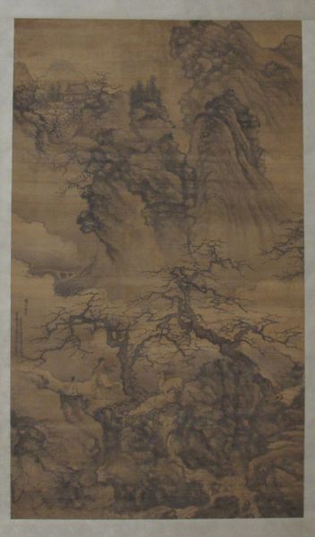 Editor: So, this is “Landscape after a poem by Wang Wei” created by Tang Di around 1323. It’s an ink painting on paper currently residing here at the Met. I'm struck by the muted tones and how they create a sense of distance and quiet contemplation. What do you see in this piece, from your perspective? Curator: As a historian, I immediately consider the Yuan Dynasty context in which this painting was created. This was a period of Mongol rule in China, a time when many Han Chinese scholars withdrew from government service. Landscape painting, like this one, became a powerful means of expressing their inner lives and philosophical ideals, a subtle form of cultural resistance, if you will. Do you notice any visual cues of literati painting? Editor: Well, the lack of bright colours, the almost monochromatic palette...it seems more focused on mood than precise representation, doesn't it? Curator: Precisely. The controlled brushstrokes, the emphasis on suggestion rather than explicit detail - all point to a literati aesthetic. Think about it - the artist is not just depicting a landscape, he’s also channeling Wang Wei’s poem, engaging in a dialogue with past masters and a community of like-minded scholars. This piece really reflects the scholar's studio, the book room, and nature’s influence to their cultural expression. Editor: So the act of creating this wasn't just artistic; it was almost a political or cultural statement? Curator: Exactly! And the fact that it's hanging here in the Metropolitan Museum, far removed from its original context, raises questions about the museum's role in shaping our understanding of art and culture, doesn't it? How we decide what to display, what stories we tell - it all impacts how people interpret this work. Editor: That’s a really interesting way to look at it. I hadn’t thought about the museum's role in that way before. It's more than just display, it's also interpretation. Curator: Yes, the social, political, and institutional frameworks are vital in any understanding of art. Glad to hear you agree!