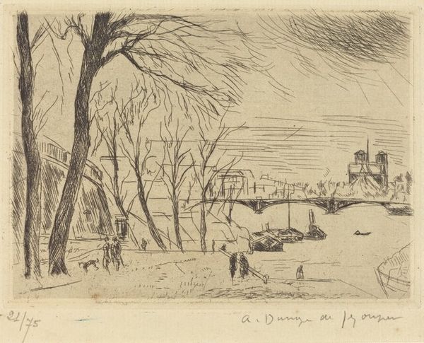 David Young Cameron created this etching, titled 'The Lea, near Ware.' Consider the late 19th and early 20th centuries, a time when ideas about national identity and belonging were increasingly fraught. In Cameron’s work, we see an impulse to capture the serene beauty of the British landscape, appealing to a sense of national pride and connection to the land. This landscape seems untouched, but the very act of selecting and framing this view speaks to Cameron’s perspective and priorities. How does the absence of people shape our understanding of this scene? Does it evoke a sense of peaceful solitude, or does it hint at a more complex history of land use and ownership? What unspoken stories lie beneath the surface of this calm, pastoral scene? Cameron offers us a glimpse into a world that is both beautiful and imbued with the weight of history.