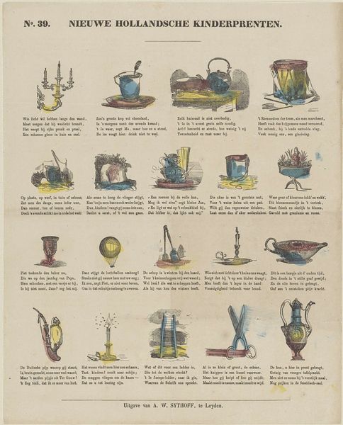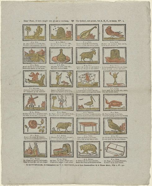 Philippus Jacobus Brepols created this print, “Van al de letters, op de letterlijst gesteld,” at an unknown date using an unspecified printing technique. The print presents a series of images, each corresponding to a letter of the alphabet, accompanied by descriptive verses in Dutch. Such educational prints reflect the Enlightenment's emphasis on reason and order, seeking to classify and understand the world through structured systems of knowledge. The piece belongs to a broader history of educational materials designed to instill literacy and cultural values. Made in the Netherlands, its creation was influenced by the rise of print culture and increasing literacy rates. It aimed to standardize language use but also reflects socio-economic conditions that shaped access to education. Further research might explore 18th and 19th-century Dutch pedagogic materials.