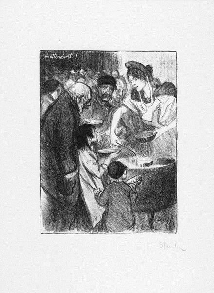 Curator: Here we have "La Reconnaissance," an etching and ink drawing by Théophile Alexandre Steinlen, created around 1907. It's quite a striking piece, wouldn’t you agree? Editor: Immediately, I’m hit by the overwhelming sense of grief. The way the figures are hunched, almost collapsing in on themselves... It feels like a physical weight. Dark. Very dark. Curator: The composition reinforces that. Steinlen uses the stark contrasts of the ink to emphasize the somber mood. Observe how the linear perspective directs our gaze to the coffins. The convergence point is almost swallowed by the shadows, creating a sense of oppressive closure. Editor: And look at the crowd. All those faces, obscured, almost identical in their grief. It’s less about individual sorrow and more about collective mourning. The title, “La Reconnaissance” – "Recognition" – does it imply recognition of death, recognition of loss? Perhaps even a recognition of shared suffering? Curator: The ambiguity in the title is certainly potent. Steinlen was known for his social commentary; perhaps he is inviting us to recognize the broader societal issues connected to these individual tragedies. Note how the etching technique creates a rough, textured surface. This adds to the feeling of rawness and immediacy. Editor: It’s a brutal honesty. There's no romanticizing here, no softening of the blow. The scene is stripped bare, leaving only the essential elements of loss and communal grief. The artist really throws you right into the heart of it. You can almost smell the embalming fluid. See the flowers. Taste the sadness. Curator: Indeed. And while the Post-Impressionist style departs from strict realism, it amplifies the emotional impact through the expressive use of line and tone. The overall formal composition reflects the harsh realities being depicted. It is heavy, like a lament. Editor: Exactly. What started as formal lines is suddenly about humanity’s dark heart. Now I look at this composition and see… more than simply people or shapes or stark monochromatic tonality. Steinlen did well to unearth some deep emotion with just a few clever swipes of an etching tool. Curator: Precisely. Thank you for these interesting insights. Editor: My pleasure.
