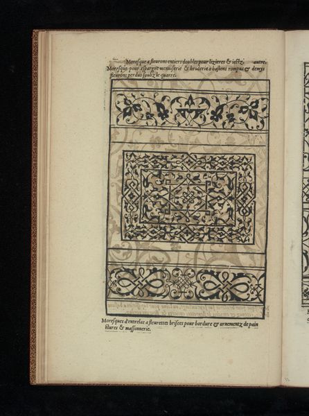 Curator: Look at this striking page from Francesco di Pellegrino's "Livre de Moresques," dating back to 1546. It’s a woodcut print, an intricate dance of lines on paper. Editor: It's immediately arresting. The bold black shapes weaving across the page create a powerful sense of contained energy. It's a design that hints at something much larger than its physical form. Curator: Absolutely. What’s interesting is how these books of moresques were utilized. They functioned as pattern books, disseminated to workshops to inform design production in various mediums, particularly textiles and other decorative arts. This speaks volumes about the mechanics of artistic influence at the time. Editor: Yes, the function here speaks volumes about circulation of design, but on an iconographic level, the weaving and looping of those arabesque forms creates such an interesting visual paradox. Is it order or chaos? Restraint or boundless freedom? Those types of questions really allow the symbolic potential to explode. Curator: The print displays that aesthetic so popularized by Islamic art. You see echoes of that same visual vocabulary in architectural details from the same period. The Livre's significance resides, I think, in the translation and dissemination of such visual languages to different audiences. It suggests a more integrated transcultural reality in 16th century Europe than we might assume. Editor: Transcultural exchange yes, but it's still hard for me to disassociate it from its symbolic weight, that constant push and pull between form and feeling. What I love, particularly, is that, though geometric, these arabesques never feel cold or mechanical. Curator: Perhaps it's in part due to the hand-hewn process of a woodblock, you see some variation in line. It has not yet succumbed to mass production and there remains this very human touch in these design books. Editor: I agree, those variations offer a certain life. Looking at it, I feel like I could trace my own emotions through those intertwining vines, mapping the flow of energy itself. Curator: It truly shows us how something meant as an artistic sourcebook can become quite powerful. Editor: Definitely! What a window into not just 16th century design, but enduring aesthetic fascination.
