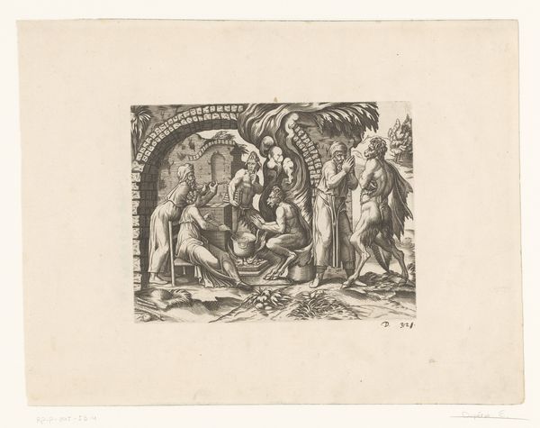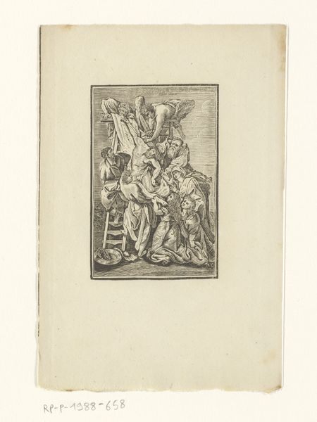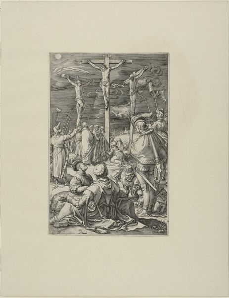 Curator: It feels like I'm peering into another dimension! The detail crammed into this print—it's astounding. Editor: You've keyed in on its powerful density right away. What we're looking at is titled "Christus aan het kruis," or Christ on the Cross, created before 1671 by Heinrich Ulrich. It’s an engraving, so every single line is painstakingly etched. Curator: The cross towers, but it’s surrounded, almost swallowed, by figures—mourners, soldiers…even other crucified figures way off in the distance. There’s such an energy, such movement—and yet it's also static, held perfectly within this frame. Editor: Yes, you pick up on that tension so acutely. Baroque art is full of grand drama and elaborate detail. But, really, let's talk about the cross as a symbolic intersection. Here, we have a meeting point, culturally and emotionally. Ulrich uses it as a stage where divine sacrifice meets human chaos. Do you see the skulls at the bottom, a memento mori, an awareness of life's temporary quality. Curator: Ugh, I see those reminders of mortality all too clearly. Skulls…so, where’s the hope? Or is the point here only that life ends, even for a divine figure? Is the crucifixion the ultimate symbol of unjust fate? Editor: It's a potent question. Traditionally, the iconography of the crucifixion speaks to both profound loss and, ultimately, resurrection. But artists play with these symbols, they aren't always didactic, they introduce their own anxieties and interpretations. What do you feel looking closer at Christ's figure here? Curator: The body seems to arch… as if pulled towards the heavens yet grounded by earthly suffering. It really captures this feeling of being utterly, horribly torn. I always have mixed reactions to these works: admiration of course for technique and…horror, always. Editor: "Horror, always" could be a succinct description of the lingering resonance. And to recognize the power to continue sparking responses after so many centuries underscores the depth of Ulrich’s artistic achievement here, don't you agree? Curator: It does. Absolutely. I still want to look away, and yet... I can't. And isn't that what great art should do, I think, keep you questioning long after you should probably leave the museum?