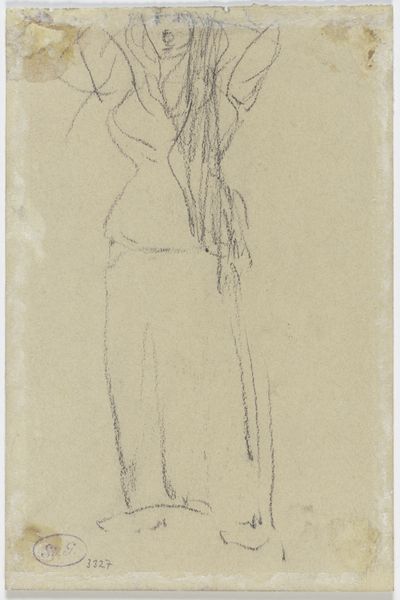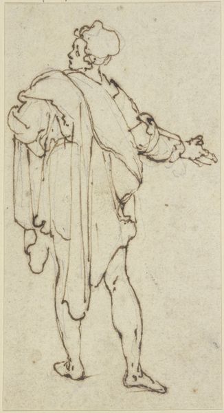 Rembrandt van Rijn created this drawing of a young man leaning on a stick with pen and brown ink. The composition is immediately striking. The figure dominates the space, leaning forward, his form a study in contrasting lines: the delicate, almost hesitant strokes defining his face against the bolder, more assertive marks delineating his drapery. Rembrandt masterfully plays with light and shadow, or rather, the implication of light and shadow through line weight and density. Notice how the concentration of ink suggests depth and volume, particularly in the folds of the young man’s garments, while the lighter, more sparse lines create a sense of airiness and ethereality. The stick the young man leans on serves not just as a physical support but as a compositional element, anchoring the figure and creating a visual tension against the forward lean of his body. This drawing functions aesthetically and as a philosophical exploration of human form and the capacity of line to evoke presence. It continues to invite interpretation, challenging us to find new meanings within its delicate yet powerful strokes.