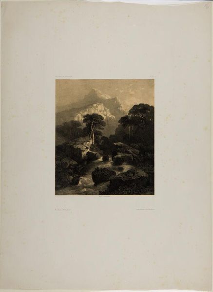 Editor: This is "Road of Scheidegg, District of Berne" by Alexandre Calame. I’m struck by how Calame uses light and shadow to create such a dramatic composition. What specifically draws your eye when you look at it? Curator: The strategic deployment of chiaroscuro certainly commands attention, doesn't it? Note how the texture is rendered – the rough, dark rocks in the foreground versus the hazy, almost ethereal mountains in the distance. It's a study in contrasts, wouldn't you agree? Editor: Yes, absolutely. It creates a real sense of depth and almost separates the foreground from the background. Curator: Precisely. The artist's skillful manipulation of tonal values and textures serves to highlight the inherent structural elements of the landscape, lending it an almost monumental quality. Editor: I hadn't considered it that way. Thank you for pointing that out! Curator: My pleasure. Close observation of form reveals so much.