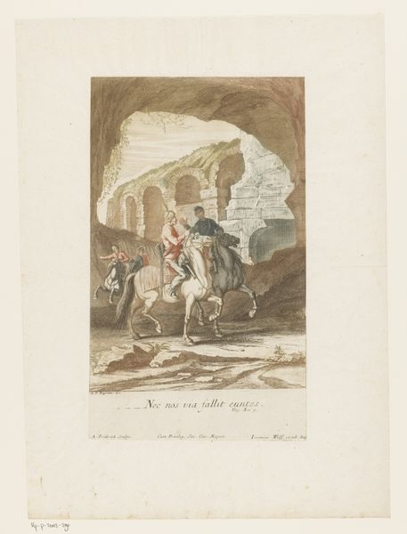 This print, "Ruiters kiezen een goede locatie voor de strijd," was made by Jacob Andreas Fridrich in the early 18th century. It depicts a group of soldiers on horseback surveying a landscape, possibly strategizing for an upcoming battle. Images like this were often commissioned to promote a patron's military victories, celebrate national pride, or disseminate political messages. In this case, the act of choosing a battle location elevates war to a rational enterprise. The landscape is rendered with enough detail to suggest a real place but generalized enough to operate as a theatre of war. Prints played a vital role in shaping public opinion and solidifying power structures. Examining this artwork as a historical document allows us to consider the conditions that shaped its creation. To understand it better, we can look at military history, the history of printmaking, and the patronage system of the time. By exploring these resources, we can gain insights into the meanings it held for its original audience.
