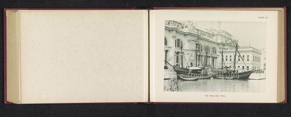 Curator: What strikes me immediately is the somber mood—almost melancholic. It's like a memory fading in shades of gray. Editor: Indeed, Charles Dudley Arnold's photograph from 1893 shows a replica of the Santa Maria at the World's Columbian Exposition in Chicago, but your point touches upon a crucial aspect of the pictorialist style which valued atmosphere above all. Curator: Absolutely. You can almost smell the dampness of the water, feel the grit of the early photographic paper. It really pulls you in despite the seemingly straightforward composition of a cityscape. The softness... Editor: Yes, Arnold manipulates the print's surface to subdue contrast. It also reminds me that constructing that ship would have involved immense labor. It's easy to forget the human effort—the sailors, the builders—lost within such celebratory imagery. Curator: I do wonder what people felt then, seeing this ship—knowing its history, its myths... Editor: Well, at the fair, the ship would have served less as a celebration of Columbus and more as a monument to American ingenuity, an example of industry at its best. I bet its construction consumed tons of resources that flowed through Chicago during its reconstruction as a modern city after the great fire, feeding cycles of building, waste, and speculation... Curator: And even so, it looks... trapped somehow. Juxtaposed to that massive building... it's lost in the enormity. Maybe that feeling speaks more honestly to its place in history than any grand narrative of progress. Editor: Perhaps. Considering the era's fascination with progress, Arnold’s photograph here complicates this celebratory idea by underlining, maybe unintentionally, labor, industrial development, and all this entailed for the world and local ecologies. Curator: Thinking about the original photograph and its texture just feels... different now, having considered the materiality alongside the visual. Thanks. Editor: Likewise, your response really gave the image another layer of consideration, moving past the documentary into something truly meaningful.