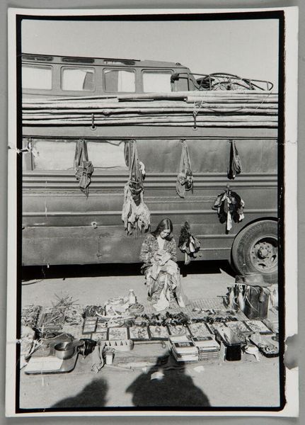Curator: This intriguing black and white photograph is by Bill Dane. Although untitled, it’s known as "Marin, Calif" from his series capturing everyday American scenes, and is now held at the Harvard Art Museums. Editor: Wow, it’s like a Caravaggio still life met a garage sale. I mean, the light, the textures—a little melancholic, right? Curator: Precisely. Dane's work often intersects with themes of economic disparity and the commodification of art, presenting a tableau of classical busts juxtaposed against the backdrop of mobile homes and the stark realities of late 20th-century American life. Editor: It feels almost theatrical, this strange collection displayed on the back of a truck. Makes you wonder about the story behind each piece, doesn't it? I'd buy the whole collection, drama included. Curator: The photograph also subverts traditional notions of value and art appreciation. What does it mean to encounter these symbols of classical beauty in such a quotidian setting? It challenges us to rethink our preconceived notions. Editor: Agreed. It throws beauty out into the world, no velvet rope necessary. I love that disruption. Gives the term "street art" a whole new dimension. Curator: Ultimately, Dane offers a powerful commentary on class, culture, and the accessibility of beauty in an often-unforgiving landscape. Editor: Absolutely. It's both beautiful and a bit heartbreaking, isn't it? I think I need to sit with this for a while.