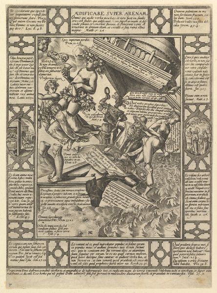 Curator: Well, my goodness, this print just throws everything at you, doesn't it? Editor: It absolutely does. This intricate engraving is entitled "Surface Decoration, Grotesque with Strapwork, Borne by Satyrs" and comes to us from Johannes van Doetecum I, around 1556. Quite a mouthful, I admit! You find it nestled in the collection of the Metropolitan Museum of Art. Curator: Strapwork? Yes, it does appear tightly wound, almost claustrophobic. There’s a sense of the organic collapsing in on the geometric, and figures that feel like they're morphing between human, animal, and decorative object. It's unsettling and playful at once. Like a fever dream rendered in ink. Editor: You’ve captured the spirit of Mannerism beautifully. Consider the period and the rise of the printing press, which offered artists new means of disseminating and commercializing their designs. Pattern books became increasingly popular, especially for artisans working in metalwork or textiles. Curator: It seems almost…anti-monumental, despite its detail. It doesn’t glorify; rather it presents this world as bizarre theater, complete with strange beasts and awkward gods. I can’t imagine seeing this in a grand palace, but instead adorning a trinket box, a private indulgence. Editor: That speaks to its functionality as a design template, divorced from traditional monumental sculpture and painting. Ornament books provided inspiration, but also implicitly reshaped aesthetic value. By disseminating such imagery, Doetecum indirectly participated in elevating "mere" surface embellishment, to being viewed almost on par with more 'noble' art forms. Curator: So, it democratizes the grotesque! Brings the unsettling and bizarre from the margins right into the middle of daily life. It is fascinating that the medium reshapes our expectations. If I were to happen upon those scenes in a mural, the story that is told by it would be much different than encountering the design in an ornamentation book. Editor: Precisely. And it blurs these boundaries—how "high" or "low" culture is created. Curator: An unexpectedly poignant reminder that art isn’t just what is *on* the wall, but *how* it got there. Editor: Yes, exactly, and for that matter *whose* wall it is meant to be on. Thanks for exploring the work with me!
