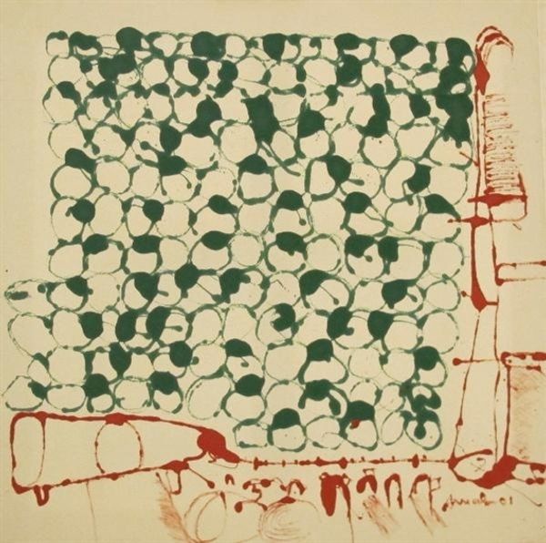 Curator: Let’s look closely at Hiroyuki Tajima’s “Benibe B” from 1961, a graphic print that really emphasizes material and process. Editor: This piece is fascinating! The red is so dominant and earthy. What particularly catches my eye are the almost mechanical impressions against the flat background. What can you tell me about this piece? Curator: Note how Tajima engages with the materiality of printmaking. This isn't a clean, polished surface; we see the texture, the wear of the printing plate. It blurs boundaries between high art and functional design. We can explore the labour inherent to this technique and reflect on art production within a social context. Consider too, the repeated geometric shapes; could this indicate the rise of industrialism impacting artistic creation, and maybe a critique of mass production, even in something considered "art"? What kind of material engagement does it suggest to you? Editor: That’s a really interesting point. I hadn’t thought about it in terms of the labour involved. The textures give a very physical impression. I like your perspective about production. How does this then speak to the viewer’s experience? Curator: The roughness and tactile quality invite a slower, more deliberate engagement. Instead of pristine perfection, we're presented with evidence of the artist's hand and the materials' inherent properties. The small variations, maybe inconsistencies in the ink transfer, become significant. Perhaps it elevates a sense of unique artistic engagement instead of a focus on perfection, even with geometrical repetitions. Do you feel invited into that space as a viewer, aware of both the work and your relationship to the materials represented? Editor: That's given me so much to think about, reframing my appreciation of this and thinking about the art-making process as something deliberately imperfect. I never expected such depth from this perspective. Thank you! Curator: My pleasure. By focusing on the materials and production, we unveil how “Benibe B” reflects broader social and economic forces. Material inquiry can definitely reshape our appreciation of art!