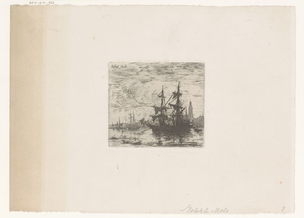 Curator: Looking at this print, what's your immediate response to the image, Editor? Editor: I'm struck by its tranquil simplicity. The limited tonal range, the etching on paper; it evokes a sense of quiet solitude on the open sea. Curator: Indeed. This etching from 1877 by Henri Seghers, titled "Zeilschepen op open water"—or "Sailing Ships on Open Water"—presents exactly the minimalist composition you describe. The sparse line work generates an impression of depth and distance, wouldn't you agree? Editor: Certainly. The careful deployment of line creates receding planes and atmospheric perspective, essential for the creation of pictorial depth in two dimensions. I'm curious how its reception may have shifted over time given the proliferation of nautical imagery in, say, national advertising, what do you think? Curator: Context matters enormously! During the late 19th century, when maritime trade and exploration were central to national identity and global commerce, this artwork functioned, possibly, as a celebration of Dutch seafaring prowess. The relatively low viewpoint suggests to me the dominance of nature. I find a powerful dialogue between culture and the individual within nature’s bounds. Editor: I like your read there, it opens up so many doors. Considering Seghers' use of the etching medium itself, its capacity for detailed yet subtle gradations. And his choice in that format invites intimacy as this piece isn’t made for grandeur but observation, do you find that interesting? Curator: Undeniably! This intimate scale focuses our attention and asks us to dwell on its nuances in ways a monumental painting simply would not. The choice is less about conveying immediate presence and more about fostering intellectual exploration. Editor: This journey into form and cultural backdrop reminds us that it’s not solely about what is depicted but, rather, the manner of its depiction and its resonance with our shared history that breathes meaning into this unassuming little seascape. Curator: It speaks volumes. Let’s turn our attention to the next piece.
