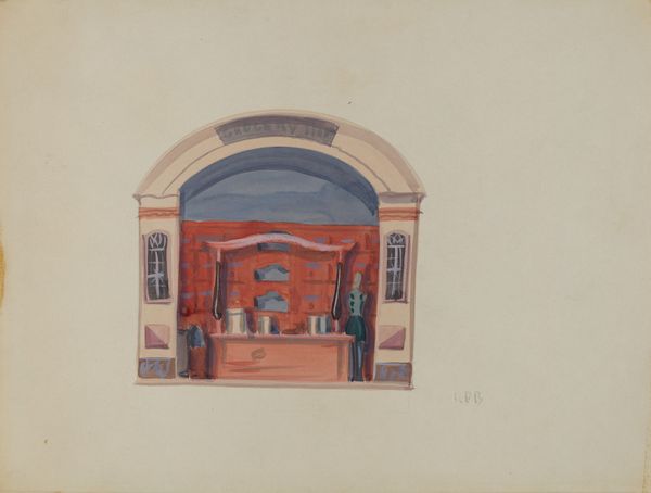 Editor: This watercolour, entitled "English Interior in India," comes to us from an anonymous artist, sometime between 1820 and 1830. I’m struck by how the open doorway frames the scene like a stage set. The patterned carpet draws the eye deep into the room. How do you interpret the spatial organization here? Curator: The artist's rendering of depth employs a sophisticated manipulation of planes. Notice how the foreground archway, defined by its stark tonality, creates an immediate separation from the mid-ground interior space. This segmentation isn't merely perspectival; it's conceptual. Consider how the textures shift – from the flat wash of the arch to the intricate patterning of the carpet. Editor: It's almost like they're presenting two separate realities. The formal entryway versus the more relaxed domestic sphere within. Curator: Precisely. The interior, further, is carefully constructed through repetition of rectangular forms – windows, ceiling beams, furniture lines – creating a sense of order. However, this rigid structure is softened by the organic shapes of the decorative objects and the curved lines of the furniture. This interplay between rigid and fluid forms prevents the image from becoming static. Editor: That tension definitely creates a visual richness. It seems intentional. Is it possible they were experimenting with formal vocabularies or breaking away from conventions of the time? Curator: What we witness here is the construction of pictorial space achieved through strictly formal means, where contrasting colours and forms are used to demarcate specific regions and suggest particular emotional and symbolic associations. I'd hesitate to frame this work in terms of experimentation; its success stems, arguably, from the application of classical principles in order to portray the scene before us. Editor: This has given me a totally different way to look at seemingly simple interior scenes. It’s interesting how close formal analysis reveals so much about design. Curator: Indeed, careful consideration of the composition and forms at play demonstrates a profound connection to visual structures.