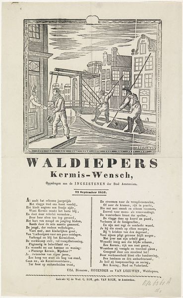 Editor: Here we have "Kermisprent van de Amsterdamse nachtwacht voor het jaar 1845," or "Carnival Print of the Amsterdam Night Watch for the Year 1845," created by Jacob Coldewijn in 1845. It's an engraving. The whole piece has such an interesting feel… a bit like looking into a time capsule. It seems to be celebrating something, but what’s striking is how the image of the city and text are combined so deliberately. What do you see in this piece? Curator: Well, beyond its aesthetic charm, this engraving is fascinating as a piece of social and cultural history. "Kermisprenten," these carnival prints, were essentially advertisements and celebratory announcements rolled into one. They weren’t just about art; they were about shaping public perception. Note the dedication: "To the esteemed merchants, citizens, and other inhabitants of the City of Amsterdam." Editor: So, it’s targeted advertising, but also civic pride? Curator: Precisely! And that building depicted is significant – the Schouwburg, or theater. It promises amusement, culture, and spectacle. The print places the Schouwburg, and by extension, the celebration of the Kermis, right at the heart of Amsterdam's identity. Why do you think the text is so prominent? Editor: Maybe because, beyond just advertising, the verses were also part of the experience? Sort of like the jingles of their time? It gives the work a populist element... a handbill designed for everyone to enjoy, with simple verses in combination with more traditional images of the town? Curator: Exactly. And consider where it was sold - "Voor de Kraanbalie." The Crane Baileys! Selling these at the center of maritime commerce underlines that Amsterdam was at its economic height, while emphasizing local traditions and public celebration. Editor: It's amazing how much information is packed into one print. I initially just saw an old picture. Now, it is starting to reflect more than just the art itself, but rather how deeply embedded art could be within culture. Curator: Yes! It serves as a great reminder that art isn't created in a vacuum.