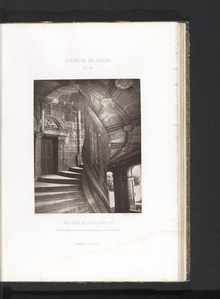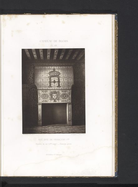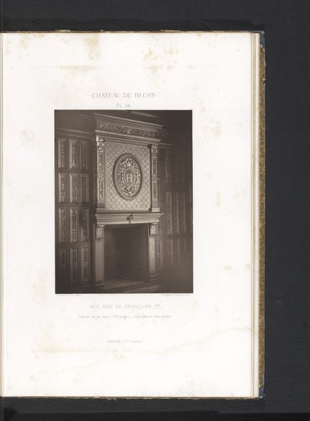 Editor: This is a photograph from before 1875, by Médéric Mieusement, called "View of a Mantelpiece in the Francis I Wing of the Chateau de Blois". It seems to be part of a book of prints. I’m struck by how solid the structure appears, the sheer weight of that stonework, and it makes me think about the construction of these elaborate interiors, it must have involved countless artisans. What do you notice in this work? Curator: It’s interesting that you immediately focus on the physical presence and labor embedded within this image, particularly when it's mediated through photography. Considering the materials used to build this Chateau—stone, wood—they speak volumes about the socio-economic conditions of the time. It highlights the raw resources available and the skilled labor required to transform them into these symbols of power and luxury. Doesn’t this photographic reproduction remove us from the object's original use? Editor: Absolutely, the photograph itself transforms the physical object. Do you think the act of photographing interiors like this contributes to a certain…fetishization of the materials? Is it like consuming luxury through image? Curator: I think you're getting to the heart of it. The photograph transforms the fireplace into a consumable image, democratizing access while simultaneously distancing the viewer from the tangible experience of the object and the socio-economic realities of its production. Consider also, how photography's reproducibility potentially devalues the craftsmanship involved, while simultaneously preserving its image for mass consumption. What does it mean that the masses can experience luxury, visually? Editor: I hadn't considered the way photography flattens the experience of labor and value. It definitely complicates how we understand historical artifacts. Curator: Precisely. And reflecting on this photo makes me appreciate both the artifice of display, and the genuine skill of workers needed to build, and capture these monuments of power and wealth.