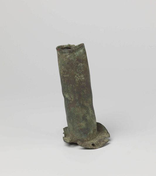 Curator: Editor: We’re looking at a bronze sculpture called "Wide-Blade Knife with Reclining Animal on Top", potentially from the Inca civilization, dating back to 1440-1540. The miniature animal figure really dominates my first impression. What catches your eye? Curator: Certainly. The knife's formal elements present an interesting paradox. Its stark, almost primitive functionality is contrasted with the highly stylized representation of the animal. Observe how the simple, symmetrical form of the blade anchors the composition, providing a visual base for the slender shaft. The texture and patination, likely accrued over centuries, speak to its age and material transformation, inviting tactile consideration. But, does the crude knife reduce or emphasize the decorative animal? Editor: I see what you mean about the contrast! It makes me consider whether the blade should even be considered functional. Curator: Precisely. The work balances the practical and ornamental, demanding that we contemplate its intended purpose beyond mere utility. The animal atop shifts the piece into the realm of symbolic object, complicating a straightforward reading. Note the deliberate construction: the linear shaft, the sharp angle that morphs into a plane. Editor: That is an excellent insight! How do these relationships, plane, angle, mass contribute? Curator: These formal attributes lead to considering this artwork as more than a simple tool. Through this interplay of design elements, a relatively common place instrument is transformed, isn't it? It now has significant spiritual or societal status. It compels us to consider indigenous notions of craft, technology, and iconography of Inca culture. Editor: This examination of formal components gives me an elevated insight and helps decode indigenous concepts of innovation, material, design, and historical background. Thanks for your explanation. Curator: It’s a testament to how focused analysis of composition, texture, and the relationship of form and figure enhances one’s appreciation for material and cultural antiquity.