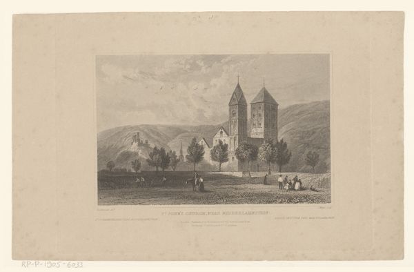Editor: This is "General View of Castle Ruins and of The Village of Saint-Necataire," a drawing by Eugène Isabey from 1831. It's a somber scene, isn't it? You have the crumbling castle overlooking this rather modest village. What do you see when you look at this piece? Curator: I see a work deeply embedded in its time, reflecting a society grappling with the legacies of feudalism. Look closely at the textures. The artist painstakingly renders the stones, the rough-hewn roofs, the worn paths. It speaks to the labor, to the material reality of the people who built and inhabited these spaces. How were those stones quarried? What were the working conditions? Editor: So, it's less about the Romantic idealization of ruins and more about the process behind them? Curator: Precisely. Romanticism is present, but let's consider the social context of its creation. The means of production are paramount. The print-making process allows for wide distribution and therefore wide social commentary, right? Who had access to images like these, and what did they represent to them? The materiality speaks to power, to the control of resources. Notice how the ruins command the hilltop, even in their decay. Editor: That’s an interesting point. So the choice of subject matter is itself a commentary on social structure and perhaps also on modes of artistic creation and consumption at the time. Curator: Absolutely! Isabey isn’t simply depicting a scene; he is subtly critiquing the historical and economic forces that shaped it. What do you think the role of landscape plays in understanding class and material production? Editor: Wow, I didn't think of it that way at all. I came in thinking "ruins equals Romanticism," but seeing it as a document of labor and social structures makes it much more relevant. Thank you. Curator: And thank you, your fresh eyes made me consider the relationship between landscape and its cultural function even more deeply.