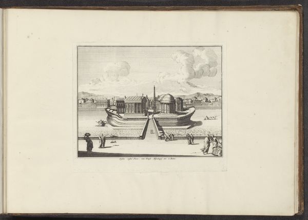 This engraving, titled *Gezicht op een paleis aan de kust in Napels*, resides here at the Rijksmuseum and was produced by an anonymous artist. Notice how the architectural mass of the palace, rendered through precise linear strokes, commands the left, its imposing columns and detailed facade suggesting a seat of power. This structure contrasts with the open, airy expanse of the sea and sky on the right. The linear perspective draws the eye towards the horizon, creating a stage for the dance between architectural order and the natural world's freedom. The engraving employs a semiotic language where the palace represents established authority, while the sea and sky symbolize boundlessness. This interplay destabilizes a fixed interpretation, inviting us to consider the fluid relationship between power and nature. The figures scattered throughout, diminutive in scale, underscore human presence within a grand tableau, prompting contemplation on the self in relation to the world.