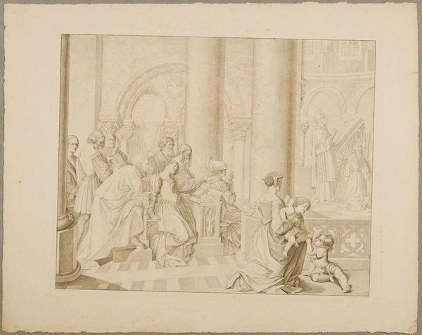 Curator: Here we have "Saint Healing a Sick Child" by Stefano Mulinari, who lived from 1736 to 1795. Editor: The sepia tones give it a very warm, almost nostalgic feeling. It's interesting how the arched composition frames the bustling scene. Curator: Mulinari was working during a time of significant social and political upheaval, and images of healing saints were often used to reinforce the power and benevolence of the Church. Editor: Yes, but note how the etching process itself—the repetitive labor of line-making—mirrors the daily struggles of the figures depicted. The saint's miracle contrasts with the work needed to make the image. Curator: That tension certainly speaks to the complex role of art in society, always caught between spiritual ideals and material realities. Editor: Absolutely. Seeing that connection between labor and image helps me understand the deeper social context of this piece.