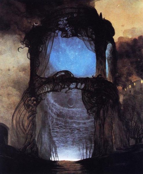 Curator: I am immediately struck by the overwhelming darkness, a feeling of enclosure, almost claustrophobia. It feels barren, heavy. Editor: This compellingly bleak "Untitled" artwork from 1972 is by Zdzislaw Beksinski. Executed in oil paint, the piece exemplifies his signature dystopian surrealism, born from a turbulent socio-political landscape in Soviet-era Poland. Curator: The very materiality seems to amplify the painting's inherent darkness. Looking at it, the deep shadows hint at a brutal process, almost carved into existence. It really plays on the weight of creating within a system that oppresses artistic freedom. Editor: Absolutely, we can examine the figures towering in the background and consider that their forms may allude to themes of control, the oppressive figures of authority bearing down, shaping not only the landscape, but individual human fate. How fascinating, as well, that in the face of this bleakness there remains the tiny figure at the base of the image holding some sort of small, but luminous, light. Curator: The narrative resonates with the artist’s experiences. It invites us to delve into the political context of the Eastern Bloc at the time, and how artists used fantastical, allegorical means to make implicit criticisms of totalitarianism and celebrate, sometimes simply acknowledge, individual resilience. There is such potent narrative here. The question becomes how those landscapes shape individuals and collectives, creating legacies that are material as much as psychological. Editor: Considering his methods, one also senses that he uses materials not merely to depict the world, but to re-create it, reflecting his anxiety through layers of visible materiality. Beksinski creates an unnerving space to express very palpable emotions: his art is less representation, more an act of material resistance. Curator: Yes, it's impossible to extract this art from its place and time. The themes explored—repression, memory, and identity—are etched in layers. The small, illuminating flame really punctuates those readings and serves to remind us to not forget what it is like to feel small against powerful authoritarian forces. Editor: Reflecting on Beksinski's painting, one truly gains appreciation for art's capacity to transmute the unbearable into visible expression, and also the value of how this labor of creating objects of resistance helps solidify memories for future generations.