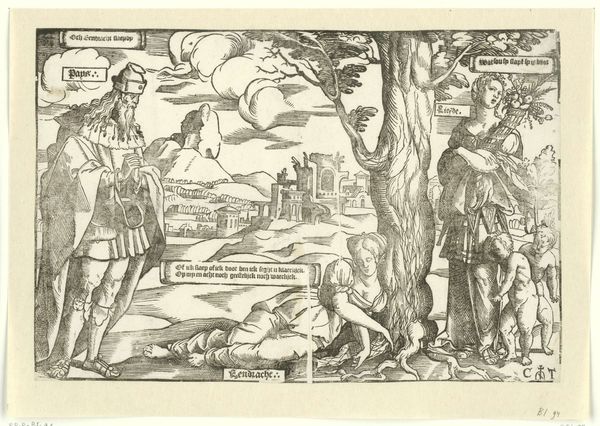 Editor: Here we have Carel Allard’s “Keizer Jozef I tegenover paus Clemens XI en koning Lodewijk XIV,” created in 1708. It's an engraving currently held at the Rijksmuseum. My first impression is that it is very crowded, with all these figures and little details squeezed in. How do you interpret this work? Curator: Well, isn’t it a deliciously biting little thing? Look closely – it’s pure political satire, playing with the tensions between Joseph I, Pope Clement XI, and Louis XIV. It feels like a playground squabble rendered in elegant lines. The artist clearly enjoys a good jab at power. Do you see how each figure is subtly, or not so subtly, mocked? Editor: I do! I see the angel wielding a sword like it’s about to pop a balloon of power… and the piles of coins near Clemens and Louis suggest something about their motives, right? It’s clever! Curator: Clever, indeed! It speaks volumes about the relationships between church and state, about alliances and betrayals, all in a visually witty package. What do you make of the cityscape backdrop, though? Editor: It places everything, but seems smaller, less important compared to the figures... It's all very theatrical. Curator: Precisely! Think of it as a stage setting for this political drama. It's a great example of how art can skewer the powerful with both precision and humor. It’s amazing how Allard captured so much drama in one image. It made me smile and think differently about the Baroque Era! What about you? Editor: Definitely. I thought the Baroque period was more serious and imposing, but this feels so mischievous and modern! I never thought I would see politics depicted like this in the 18th century!