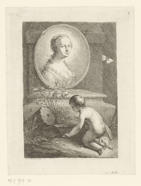 Christian Bernhard Rode made this print of Ewald Friedrich von Hertzberg. While undated, it likely reflects the cultural and political milieu of 18th-century Europe. The print presents us with a portrait of Hertzberg. Below the portrait, a cherubic figure extends a laurel wreath, symbolizing honor and victory. The print blends classical symbolism with portraiture, common for commemorating influential figures during the Enlightenment. Hertzberg was a prominent statesman in the court of Frederick the Great. His identity was deeply intertwined with his role in Prussian politics and diplomacy. Rode's artistic choices in the print reflect Hertzberg's status. This representation served to reinforce the social hierarchy of the time. Consider how portraiture could immortalize individuals, shaping their legacy through carefully constructed images. How does this blend of the personal and the political in this print invite us to reflect on the construction of identity?
