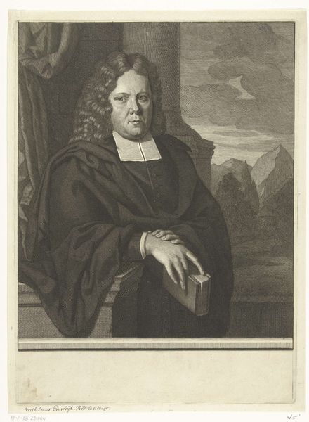 Curator: This engraving, dating roughly from 1639 to 1670, is titled "Portret van Michiel Boudewijns" and was created by Petrus Clouwet. The subject, Michiel Boudewijns, appears to have been a doctor or professor, as the Latin inscription indicates he lectured on anatomy and surgery. Editor: The linear precision is striking. Look how Clouwet defines form with only the subtlest variations in tone. The composition itself feels formal and imposing; it truly communicates the subject's authority. Curator: Authority derived, I would argue, from his profession. This isn’t merely a portrait; it's a testament to the rising social status of the medical profession during the Baroque period. The tools laid out, the book displaying an anatomical illustration… these are signals that he, and potentially Clouwet, wished to show off his expertise and trade. Editor: Agreed, those compositional choices contribute enormously. He's even pointing directly to an anatomical drawing within the book – guiding our own dissection of the artwork. Note also how Clouwet manipulates line weight to differentiate planes, achieving remarkable depth despite the monochromatic medium. The lines of his face and collar are crisp, versus the finer hatch-marks in the shadows Curator: And considering it's an engraving, the level of detail is extraordinary. Think about the labor invested in this piece—the skill required to manipulate those fine lines with burin on a metal plate, suggesting a long apprenticeship. This labor contributes to the high regard in which printmaking, like this example, was then held, blurring the line between craft and fine art. Editor: Exactly. It’s that tension between art and labor that gives the work its distinct power. We see Boudewijns depicted through expert artisanship of Clouwet's own expert skill. A sort of mutual validation. I'm drawn in now to the lines along his sleeve, reflecting light and shadow—creating an interesting parallel visual movement to his pointer. Curator: Reflecting, I think, that beyond the formal pose, this print also served a functional purpose—disseminating knowledge and enhancing Clouwet’s and Boudewijns' reputations within intellectual and medical circles, creating opportunities of collaboration or patronage. Editor: So much conveyed through lines on paper! Its success resides both in Clouwet’s technical skill, and the context it gives to subject and patron. Thank you.