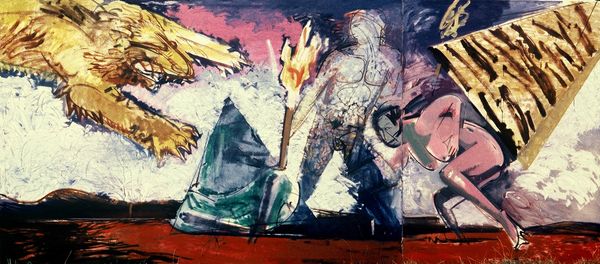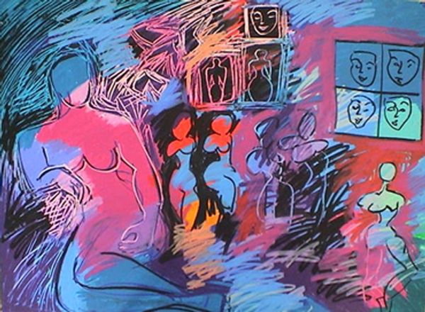 Editor: Here we have Vasiliy Ryabchenko's "Near the Fountain," a mixed-media collage created in 1989. There’s a striking contrast between the stark figure and the abstract background. How do you interpret this work? Curator: It’s tempting to view Ryabchenko's "Near the Fountain" through a postmodern lens, where the mixing of media and fragmented imagery reflects a breakdown of traditional artistic hierarchies. Considering this was made in 1989, just before the collapse of the Soviet Union, might this jarring composition speak to the societal fragmentation and ideological crisis of that moment? Note the nude figure - a loaded and symbolic presence – does she feel defiant, exposed, or perhaps both? Editor: Defiant, I think, given her pose. But I also notice how her figure seems almost superimposed onto the background. Curator: Exactly. And this superimposition becomes crucial. The "fountain" motif, combined with the nude figure, draws from classical traditions but disrupts them. How does Ryabchenko subvert traditional notions of beauty and the idealized female form? Think about feminist art practices – might he be engaging in a dialogue with these ideas? Editor: So, by juxtaposing this classic form with a chaotic, almost graffiti-like background, he’s creating a deliberate tension? Is he perhaps making a statement about the commodification of the female body? Curator: Precisely. And consider how the "nearness" to the fountain, this place of supposed purity, is undermined by the raw, almost visceral treatment of the surrounding space. Could Ryabchenko be critiquing the romanticized image of femininity often associated with such settings, and reclaiming space to center different, perhaps even opposing, narratives and truths? Editor: That’s really powerful. I hadn’t considered it in relation to the socio-political climate and feminist discourse. Curator: These historical and theoretical lenses offer crucial pathways into understanding art, connecting seemingly disparate elements to broader, ongoing dialogues. Editor: I’ll definitely carry that with me. Thanks so much for your insights.