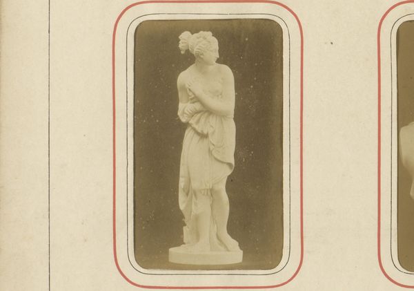Editor: Here we have a page from *The Madame B Album*, dating back to the 1870s. It's an albumen print – a photographic print made on paper, embellished with a decorative frame of painted foliage. The framed image presents a sculpted figure reading a book atop a pedestal. What first strikes me is the combination of the photographic precision of the figure against the hand-painted embellishments around it; how might you interpret that juxtaposition? Curator: That combination speaks volumes! It hints at the way photography, even in its nascent stages, was being integrated into existing visual traditions, in this case, a very personal one of albums. Notice how the painted frame almost softens the "mechanical" nature of the photograph? It’s as if Madame B wanted to domesticate and personalize this reproduction of sculpture. This image is of French origin. Knowing this, what are some symbols here that tell you more about French history at the time? Editor: Well, it almost presents an imagined ideal of refinement, linking classical sculpture and natural beauty through a lens of personal expression. I am wondering about the decision to represent this man through sculpture, in lieu of just a photographic portrait. Curator: Exactly! In this historical context, sculptural depictions often symbolized permanence and ideal virtues, connecting the sitter with historical archetypes. So, Madame B's album page does not simply showcase a piece of artwork but evokes timeless qualities and establishes the sitter within a continuum of cultural and intellectual achievement. It may not be this *specific* man the artist is interested in representing! What are your thoughts on the symbolic reading of books and men? Editor: I find that insightful; I had missed those more profound cultural symbols! Looking closer now, I am moved to appreciate that visual interplay you identified; how symbols across history can be internalized to mean different things across the eras. Curator: It truly highlights the enduring appeal of classical motifs within modern artistic practices, adapted to individual sensibilities. A single page can reveal the threads connecting art history, personal identity, and cultural memory.