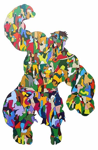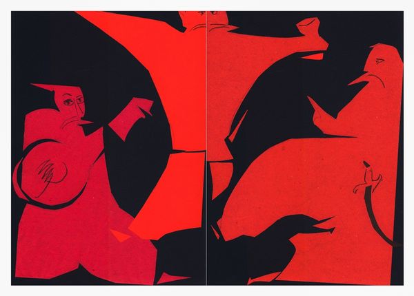 Editor: Here we have Oliver Lee Jackson’s "Triptych (3.20.15, 5.21.15, 6.8.15)," made in 2015. It looks like a mixed-media piece, probably with acrylic paint involved. It definitely feels dynamic and full of energy. What are your thoughts? Curator: This triptych exemplifies Jackson's commitment to pushing material boundaries. It begs the question: How does the choice of acrylics – a relatively modern, readily available medium – affect the overall reading of figures engaged in what looks like movement? Editor: That's interesting, because you don’t see that particular medium in all abstract expressionism! So you mean, like, how accessible or industrial it might seem? Curator: Exactly. Does the acrylic’s almost synthetic quality contrast with the timelessness of figuration? Also, how do you perceive Jackson’s technique of layering colours? Consider it as a record of labor; he meticulously applied each layer. How does this contribute to your understanding of his creative process? Editor: I see what you mean, how his choices in materials highlight the means of its creation and even maybe influence our reading. The flat areas of bright colour seem almost screen-printed, suggesting a kind of manufactured image. I am seeing that everywhere. Curator: Precisely! The tension lies in the meeting of high art and seemingly mass-produced visuality, prompting us to reflect on Jackson’s critique, or celebration, of consumer culture within art production. I think it's more playful and experimental in pushing art's boundaries. Editor: I see that tension much more clearly now – thanks! I never would have seen it if I had focused on it in a traditional analysis, like color and composition. Curator: That's exactly the kind of observation this piece encourages! We see art both in terms of process, of the actions behind its making, and within a broader world of material and industrial concerns.