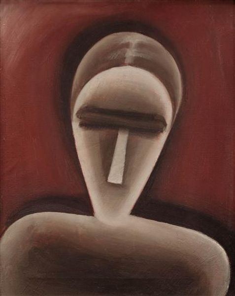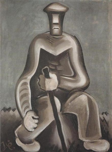 Editor: So, this is Josef Capek's "\u017debra\u010dka s d\u00edt\u011btem," painted in 1918. It's an oil painting, and I'm immediately struck by the somber mood and the way the figures are almost abstract, especially the faceless mother figure. What social statements do you think Capek was trying to make? Curator: Capek painted this during a period of immense social upheaval across Europe. Consider how the geometric shapes and muted colors evoke a sense of dehumanization and alienation, mirroring the trauma of war and the economic hardship faced by many mothers and children. How does the facelessness of the mother relate to broader societal issues around female identity during that time? Editor: It’s as if she’s been stripped of her individual identity, representing all mothers struggling during that period. The simplification almost universalizes her experience. Curator: Precisely. And it's important to remember that Capek was deeply involved in avant-garde circles, reacting against traditional modes of representation. Do you think the lack of individual features shifts our focus towards the themes of poverty and societal neglect, rather than individual suffering? Editor: I see what you mean. It's less about one specific mother and child, and more about the systemic issues that created their hardship. What role does Expressionism play here in emphasizing these social critiques? Curator: Expressionism served as a vital tool. Capek uses the style not just for aesthetic reasons but as a visceral language to protest against the status quo, highlighting the emotional and physical toll exacted by societal forces on marginalized groups. It pushes the viewer to confront uncomfortable realities. Editor: That gives me a totally different perspective on it. I was caught up in the artistic style but missed the broader context. Curator: Indeed, recognizing art as embedded in its sociopolitical landscape expands our understanding beyond the purely aesthetic and enables a more nuanced, critical appreciation. Editor: Thank you. I am so glad to understand how that context helps uncover deeper meanings and connect the art to real-world issues.