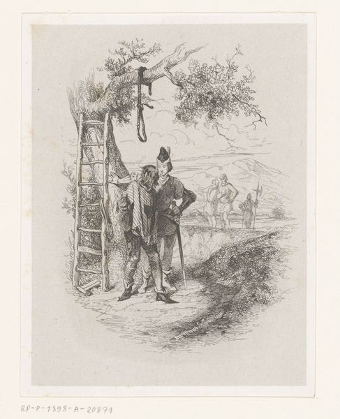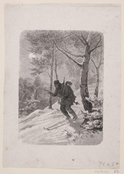Curator: Before us hangs "Lumbering in Winter," a wood engraving from 1871 by Winslow Homer, printed in "Every Saturday." The print portrays two men in a snowy forest, engaged in the arduous task of felling trees. Editor: It strikes me as a bleak depiction. The monochromatic palette and sparse composition—stark vertical tree trunks dominating the space—evoke a sense of isolation and the harsh realities of winter labor. Curator: Indeed. It speaks to the changing socio-economic landscape of post-Civil War America. We see the romantic vision of rural life giving way to the industrial demands of the era. Consider how illustrated periodicals like "Every Saturday" disseminated such images, shaping public perception of work and the environment. Editor: I'm drawn to the contrast in textures. The smooth snow against the rough bark of the trees, the delicate lines defining the figures against the dense background. It's an interplay that creates depth and a rather melancholic rhythm. Curator: Homer, early in his career, often depicted scenes of everyday life. Here, he confronts the complex relationship between humans and nature. Lumbering, essential for economic growth, came at the expense of environmental degradation. It is an undercurrent throughout the image. Editor: It also suggests a psychological narrative, though a subtle one. The lumberjack in the foreground with his ax raised appears ready for hard work, while the figure in the background has an almost spectral presence, bending under the weight of labor. I find that asymmetry visually compelling. Curator: It is these details, published widely, that fostered awareness, albeit gradual, about deforestation and the working conditions of laborers, a commentary often absent from idealized landscapes. Editor: Viewing it today, I recognize that the artist achieves a powerful graphic quality with limited tonal range. The figures are almost silhouetted which adds to the drama. I will walk away reflecting on man versus nature, that much is certain. Curator: Exactly. The work, while seemingly straightforward, quietly documents this tension and its integration into American culture and the environmental impact we continue to deal with.
