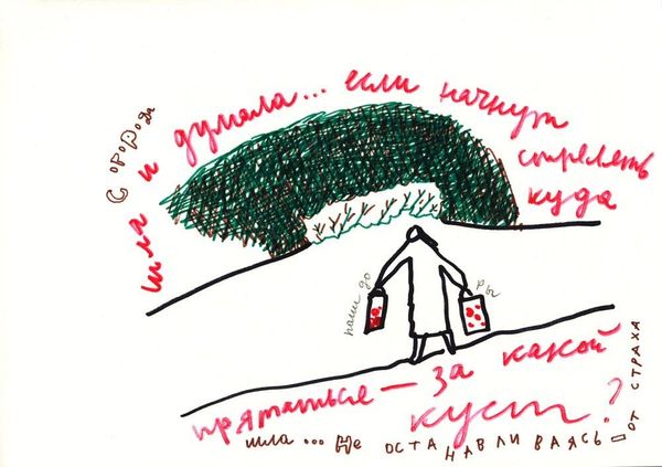 Curator: Alevtyna Kakhidze, a contemporary Ukrainian artist, made this piece in 2017. It’s called "Untitled. Strawberry Andreevna," created using ink on paper. Editor: It looks almost like a child's map, a whimsical but unsettling depiction, perhaps of movement and displacement. Curator: That childlike quality might be intentional. Kakhidze often engages with socio-political issues, and this work, rendered in a seemingly innocent style, belies the serious context. Notice how place names are scattered across the paper, connected by dotted lines, little groups of figures congregating near some of them. Editor: The lettering itself has such personality – "Bakhmut" written in large, flowing script compared to the smaller, neater "Konstantinovka". It adds an almost diary-like intimacy, making it personal, like a visual note. What can you tell me about the flags on top? Curator: Those simple flag drawings, positioned almost like markers on a battlefield, really caught my eye too. Given the timeframe, 2017, and Kakhidze's Ukrainian identity, these flags might symbolize a contested border or regions impacted by the ongoing conflict in eastern Ukraine. Flags operate as powerful shorthand for larger sociopolitical realities. Editor: So, it's not just a journey but potentially a forced migration route then, mapped out in such a fragile way. And the splashes of red ink... they're concentrated near place names like "Zaitsevo" and "Maiorsk," giving them greater presence on the page, as if they’re more dangerous or heavily affected. Curator: Absolutely, those red annotations do seem to act as visual warnings, punctuating points of tension along the depicted path. What resonates is how Kakhidze uses such simple forms – hand-drawn figures, handwritten text – to convey complex issues of identity, displacement, and political struggle. The informality invites us closer, making it hard to look away. It prompts one to remember those figures are more than scribbles, those regions, more than mere notations. Editor: The starkness of the ink, and paper lends a haunting effect, doesn't it? Despite the work's seemingly basic style, it sticks with you. There is great potency in its pared down execution. Curator: Indeed. By layering personal mark-making onto the political landscape, Kakhidze effectively gives a voice to the often-unseen human cost of geopolitical conflict. It's a powerful example of how art can function as both a record and a form of silent protest.