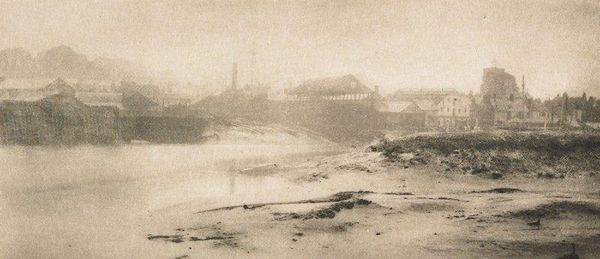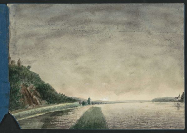 Curator: This monochrome watercolor by Winston Churchill, titled "Evening Glow at Mimizan," captures a tranquil waterside scene. Editor: It’s instantly calming, isn’t it? The simple composition, dominated by these graduated grey washes, evokes a kind of melancholy, a stillness. Curator: Churchill painted this, presumably *en plein air*, reflecting a broader cultural moment that idealized the meditative experience of immersing oneself in natural environments for wellness. We might think of Virginia Woolf doing exactly that, along the banks of the River Ouse. How does Churchill, in particular, engage with discourses around class and leisure? Editor: Well, consider the man and his pursuits: watercolor painting, an aristocratic pastime; an exercise accessible precisely due to the access he would have had to the necessary resources. But I’m more immediately drawn to the handling of the watercolor itself. It’s skillfully rendered—see the variations achieved with such a limited palette, creating atmospheric perspective. Curator: True, and the almost hazy depiction, I believe, resonates with similar sentiments about reclaiming nature that were present in contemporaneous responses to the mass production of WW1. Here is Churchill seeking quiet respite amongst the visual representation of a land far removed from trenches. We must always remind ourselves of his politics within that space. Editor: Perhaps; I’d suggest, more concretely, an appreciation for the labor involved in creating these washes and subtle tones and contrasts that describe sky and water. I also like how the horizon is more sensed than seen, which brings all focus to that darker bank of the painting and water itself, blurring where those two aspects even separate in the picture plane. Curator: I concur. The monochrome palette amplifies that blurring effect, but can also flatten space in ways that seem naive and perhaps at odds with someone known for strategic thinking. In a way, this piece reminds us of art's capacity to be both an exercise in, and an escape from, complex, power structures. Editor: And ultimately an escape into the mastery of a physical material, in this case watercolor. I am drawn to consider its specific challenges. It all speaks to different facets of one, very famous, figure. Curator: Indeed, it complicates him and allows us to view him as part of this wider cultural discussion on the horrors of progress. Editor: Exactly, this close look offers much food for thought about environment, material practice, and the relationship between making and being.