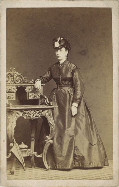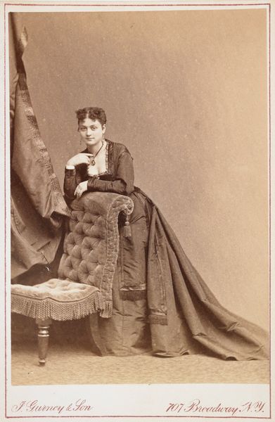 Editor: This is Pierre-Louis Pierson’s "Série à la Ristori," a portrait printed as photography, from the 1860s. The subject, a woman in a dark, fringed dress, reclines melancholically on a tufted chaise lounge. She seems almost lost in thought as she gazes into a mirror. What draws your eye when you look at this image? Curator: Oh, that pensive gaze mirrored... almost haunted, isn’t it? It pulls me into this delicious, melancholic world. It is a beautiful dance of light and shadow typical of that era. I wonder what she's pondering…perhaps her roles onstage? The mirror becomes a sort of collaborator, adding another layer of her being. Does it feel staged to you, or like a genuine glimpse of ennui? Editor: Staged, definitely, but in a way that’s also revealing. Knowing it’s from the 1860s, there's a clear intention in its creation. It’s less candid, more deliberate, right? Curator: Exactly! Photography at that time was often about crafting a specific persona. Think about it – capturing an image involved a whole ritual! It couldn't possibly be unscripted. Also, there is an aesthetic in using props and poses, a way of setting the stage, to me, and showing how photography could borrow some theatrical flair from performance. Editor: So it's like a play in a single image. It makes me rethink how 'real' any photograph can be, especially then. Thanks! Curator: Precisely! I think it also pushes the envelope of self representation; a fascinating perspective. It's about being captured *and* crafted simultaneously.