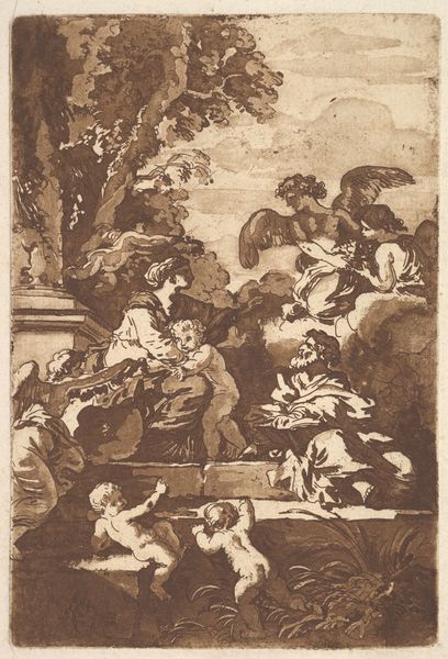 Gerard de Lairesse rendered this drawing, “Design for Title page: Clio Taking Dictation from Minerva,” with pen and brown ink. Here we see Clio, the muse of history, poised to record divine wisdom, under Minerva's guiding influence. This motif of divine inspiration echoes through the ages. Consider the ancient Greek poets who invoked the Muses for their epics or, much later, medieval artists portraying evangelists receiving direct inspiration from God. The act of writing, here, transcends mere transcription, becoming a sacred act, imbued with the authority of knowledge. Minerva, the Roman goddess of wisdom and strategic warfare, presents an intriguing figure. Armed with a spear and helmet, her presence suggests that knowledge is not merely intellectual but a powerful, strategic force. We see Minerva as Athena in ancient Greek art, a symbol of civilization, law, and victory. This enduring symbol invites us to consider the emotional weight carried across time—wisdom as a force to both protect and inspire.