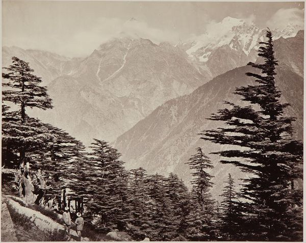 Curator: Just look at this striking landscape! This is Samuel Bourne's photograph, “Buspa Valley, Gangootri; Snowy Peaks Near Gangootri, from Bhairamghati.” Editor: My first impression is of a world teeming with ancient secrets, a sacred grove perhaps. It's as if these trees guard the gateway to something…untouchable. Curator: Bourne was a master of capturing the sublime. His work, often created on arduous expeditions, also reveals the complicated history of the British presence in India. How do you see this tension playing out here? Editor: Absolutely. Bourne's image is not just a landscape, but a loaded document. Consider the colonial gaze that framed this "untouched" vista, or the environmental impact his expeditions must have had. Curator: Precisely! Perhaps by acknowledging these complexities, we can move toward a more nuanced and historically informed appreciation. Editor: Yes, by viewing art as a catalyst for conversations about power, privilege, and responsibility.