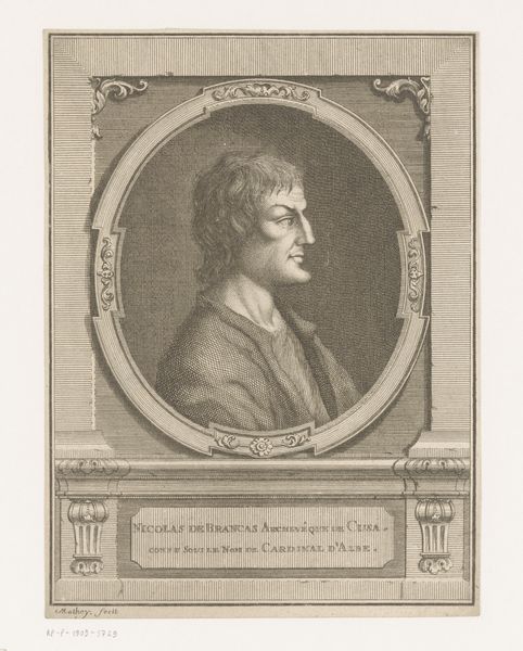 Curator: Ah, this delicate portrait captures a certain thoughtful intensity, don’t you think? It's titled "Portret van Jean de Labadie." Editor: Yes, I am immediately struck by that somber aura around him. Is he in mourning? It almost feels like a shadow box of melancholy! Curator: He has a fascinating story, actually. It was created by Gerard de Lairesse, most likely before 1668, and crafted with ink on paper. It currently resides at the Rijksmuseum. Labadie was a rather influential, although controversial, French pietist. Editor: Right, the ink really contributes to this feeling—it seems as though light barely glances off him. Technically speaking, the oval frame, heavily decorated in foliage, only adds to the sense of contained introversion. Curator: Indeed. De Lairesse uses the contrast beautifully—see how the tight hatching defines his features while his garment is just broad washes? You almost feel the weight of his intellectual scrutiny bearing down. Editor: Yes! There’s such attention to structure, wouldn't you agree? Consider the acute angles formed by the collar, directing one's focus right toward his gaunt visage. It’s a masterful visual constraint, heightening the sense of gravity. Curator: There’s something else, though, I think, beyond technique—I find myself wondering about their connection, artist and subject. Did De Lairesse intuit some of Labadie's spiritual conflicts? Editor: That might be the key here, truly; a powerful interplay between medium, composition and the emotional tenor within the portrait. This wasn't mere depiction; De Lairesse truly manages to ensnare his viewer to a certain disposition. Curator: Exactly! It’s almost as if the ink carries a whisper of Labadie’s convictions. Editor: So, more than just line and form – it's about feeling the weight of faith in this small rectangle, so eloquently and expertly drawn! A truly wonderful peek into a man's soul.