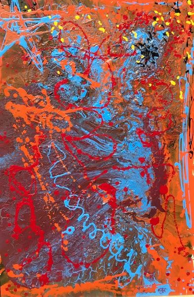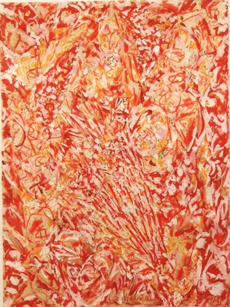 Editor: This is "Cosmic Fire #733," a mixed-media work created in 2009 by Jack Armstrong. It strikes me as chaotic, yet there's an undeniable energy radiating from the canvas. What aspects of its making stand out to you? Curator: The sheer physicality of its production is compelling. Looking at the acrylic paint flung across the surface, we must consider Armstrong's process. Was it about spontaneous gesture or meticulous control? Either way, we confront the labor involved, a key aspect often overlooked in discussions of abstract art. How does this compare to industrial modes of production and mass culture? Editor: So, you are talking about labor intensity in art-making, even in supposedly spontaneous abstract expressionism? Curator: Precisely. Think about the post-war context in which abstract expressionism arose. It's not merely about individual genius; it is an exploration of materiality. In pieces like this, that echoes with Cold War anxieties, challenging what “making” really meant. How does Armstrong, by naming himself “cosmic,” want the viewer to interpret “the creative power?” Editor: It’s like he’s saying that even chaotic freedom, is also the outcome of labour with clear intension to convey something! Curator: The paint itself, its texture, the way it's been layered – each element reveals a deliberate choice. We see then not just an image, but also a record of its creation, mirroring shifts from handcrafted objects to industrialized products. This prompts us to challenge boundaries and look at value we impose through material use. Does it still communicate ideas about the role of the individual? Editor: I'm starting to see abstract art through a new lens - one that considers process and materials in connection with broader cultural themes. I'll remember that. Thank you. Curator: Indeed! By scrutinizing the labor and materials, we uncover meanings and challenges within works such as “Cosmic Fire #733". We recognize then the inherent values society has to share, question and/or reaffirm when looking at any piece of art.