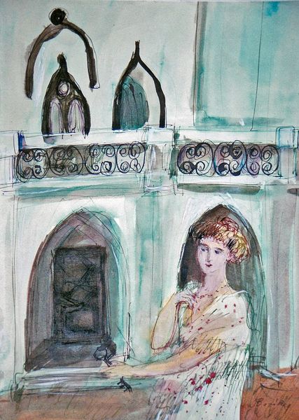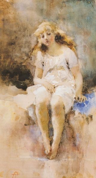 Editor: So, this is Maria Bozoky’s "Poet, Gabriella Baumberg", a watercolor painting. I’m immediately drawn to the delicate, almost ephemeral quality of the watercolor and the expressiveness. It’s so loose! How can one begin to think about approaching this artwork? Curator: The looseness you describe actually gives us a fantastic entry point. Note the artist's conscious decision to prioritize the fluid materiality of watercolor. How does this choice inform our understanding of the subject? Does the lack of precision equate with the traditionally free thinking of poets? Editor: Interesting! I hadn't considered that. The fluidity really captures the feeling of… maybe the messy process of writing? The paper seems almost raw too. Curator: Exactly. Think about the paper itself as a manufactured surface, commodified and consumed. What statement might the artist be making by exposing its absorbent qualities to the washes? Do the runs and bleeds point towards something inherent to the cultural function of the writing profession? How many iterations does the 'poet' work on before presenting? What is accepted? Editor: I guess the messiness highlights the labor involved, taking it away from a romantic ideal of a poet with instant inspiration, and focusing more on what actually went into its realization. That perspective transforms my idea of the artwork. I initially just saw a portrait, but it speaks about materiality. Curator: And do we see here class boundaries, in the simple making available, to some, of ink and paper? Editor: True. That’s given me a totally new way to consider how artistic choices convey so much more than just the subject matter. Curator: Indeed, from process to paper, a complex tapestry unfolds!