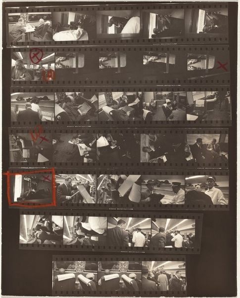 Robert Frank created "Congressional G," a gelatin silver print, sometime in the mid-20th century. The composition presents a series of frames, each capturing fragments of scenes that seem interconnected yet disjointed. The high contrast intensifies the granular texture, giving a raw, unfiltered look. Frank destabilizes conventional photographic representation by revealing the editing process, traditionally hidden. The film strip format, complete with sprocket holes, emphasizes the material reality of photography, not just its illusory capacity. The red marks scrawled across certain frames further disrupt any sense of seamless narrative. The repetition and variation within the frames create a visual rhythm, almost like musical bars, yet the narrative remains fragmented. The images challenge the idea of photography as a transparent medium, instead highlighting its constructed nature. Through the visual structure of the contact sheet, Frank compels us to consider the act of seeing, selecting, and interpreting.
