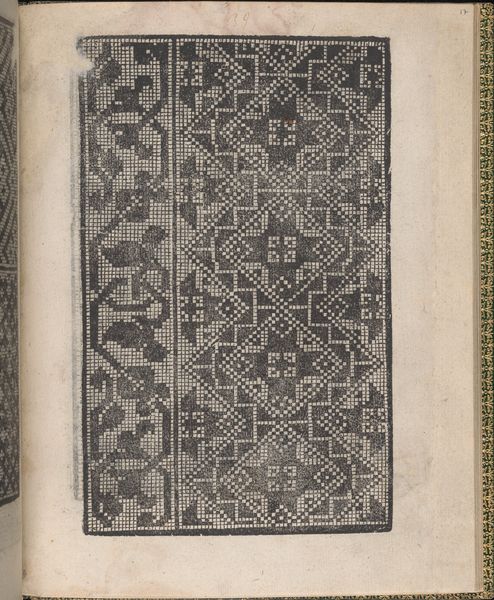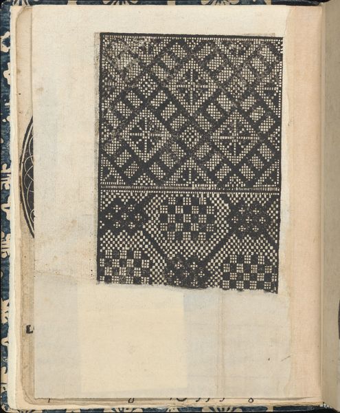 This is page 29v from *Ein new kunstlich Modelbuch...*, made around 1530 by Peter Quentel, using woodcut on paper. The stark contrast of black ink against the off-white paper immediately captures our attention. The design is bisected horizontally, featuring intricate geometric patterns that command a formal analysis. The composition reveals a structured approach to pattern-making, one which destabilizes the established meanings of ornamentation by engaging with early forms of visual coding. Note how the arrangement of crosses and dots are not merely decorative but function as signs within a semiotic system, hinting at deeper cultural codes related to craftsmanship and design. The texture, achieved through the woodcut technique, adds a tactile quality that invites us to consider the materiality of the design itself. The artwork's engagement with pattern and repetition reflects broader artistic and philosophical concerns. We can appreciate how Quentel's design functions both aesthetically and as a reflection of the evolving cultural and philosophical discourses surrounding art and design.